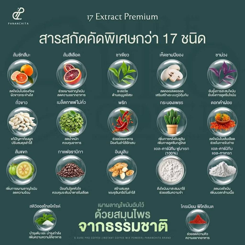 Pananchita S Sure Pro Coffee is a specially formulated instant coffee that blends aromatic Arabica coffee with 17 premium natural extracts, including: